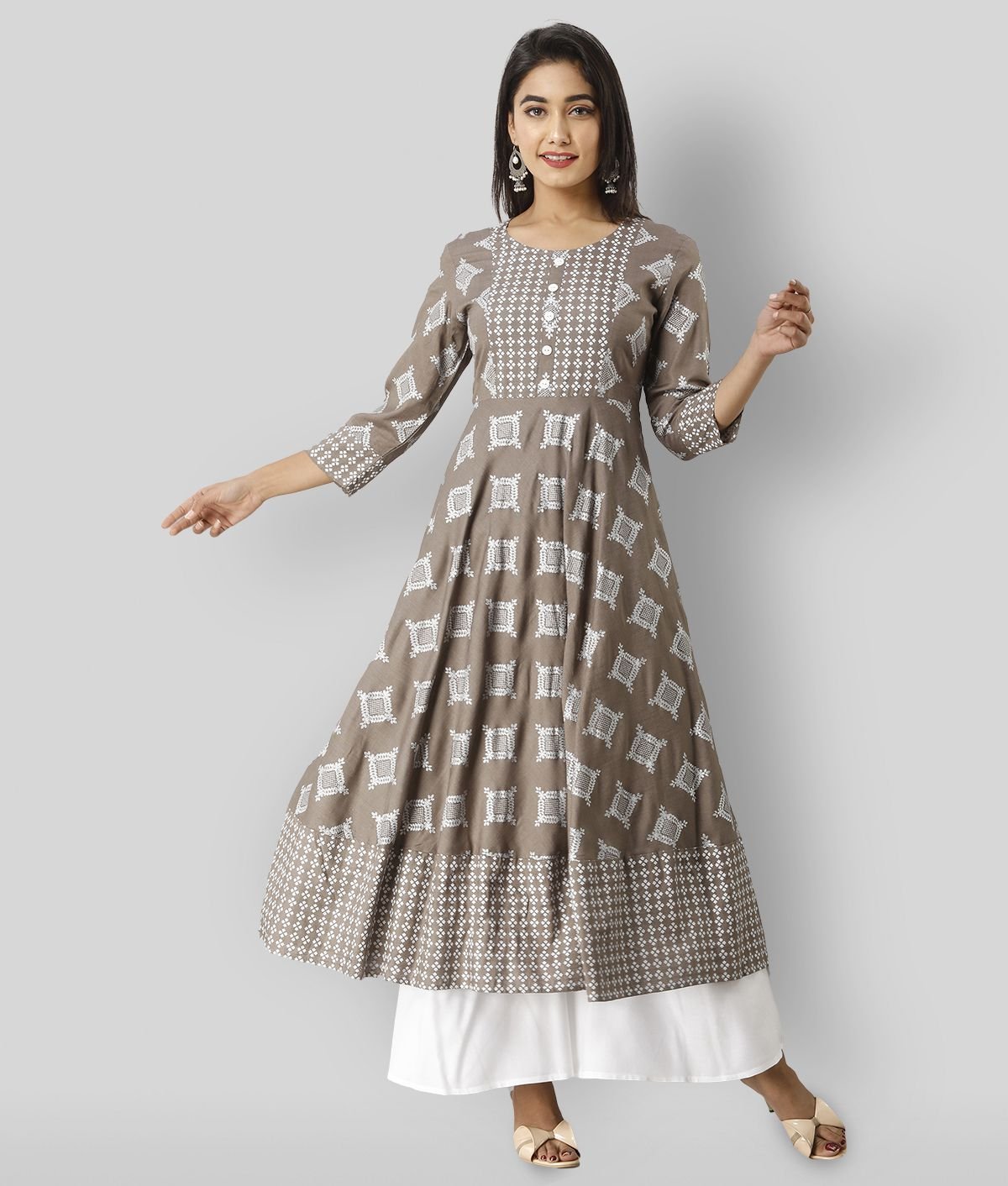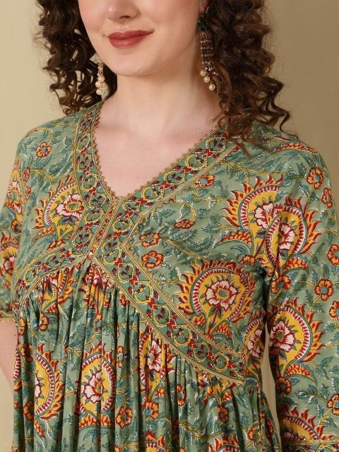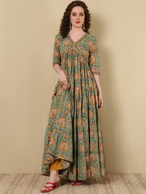 GLAM ROOTS Floral Printed V-Neck Anarkali Kurta