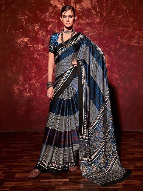 Saree mall Navy Blue & Black Striped Satin Sarees