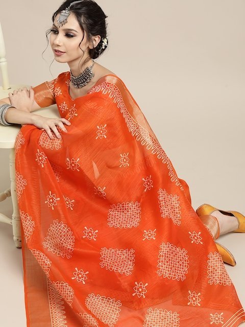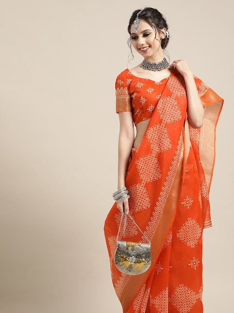 Saree Mall Trendy Orange and Beige Linen Blend Saree