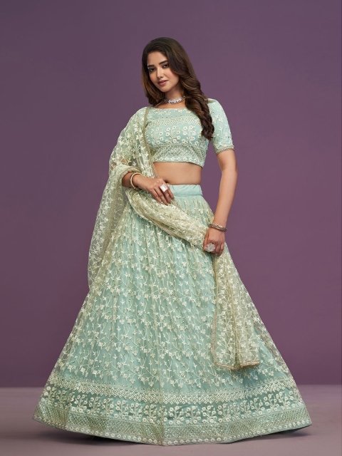 Green and white embroidered lehenga choli with dupatta, sequinned