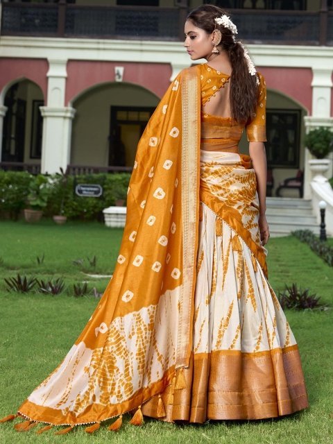 Mustard and cream-coloured printed lehenga choli with dupatta, has bandhani technique and